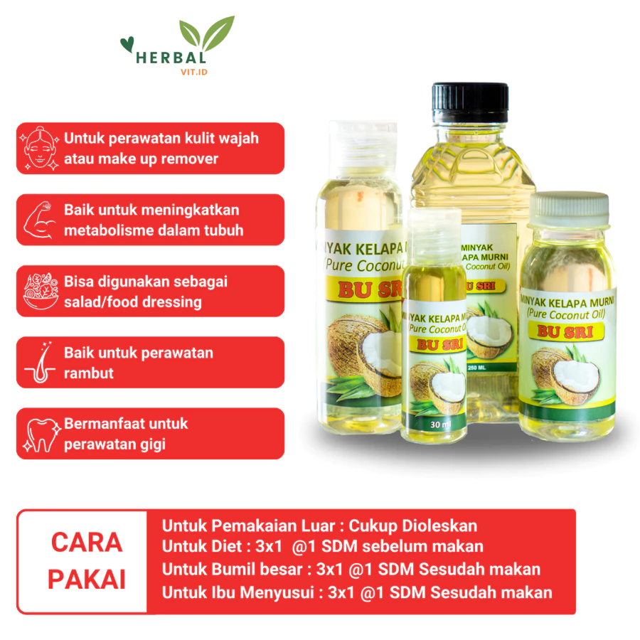Moms, jangan ragu lagi untuk beralih ke gaya hidup sehat. Minyak kelapa murni untuk diet dan kesehatan adalah investasi jangka panjang untuk kita dan buah hati. Dengan harga minyak kelapa murni asli 1 liter atau ukuran kecil yang kompetitif, produk Bu Sri ini benar-benar penyelamat!